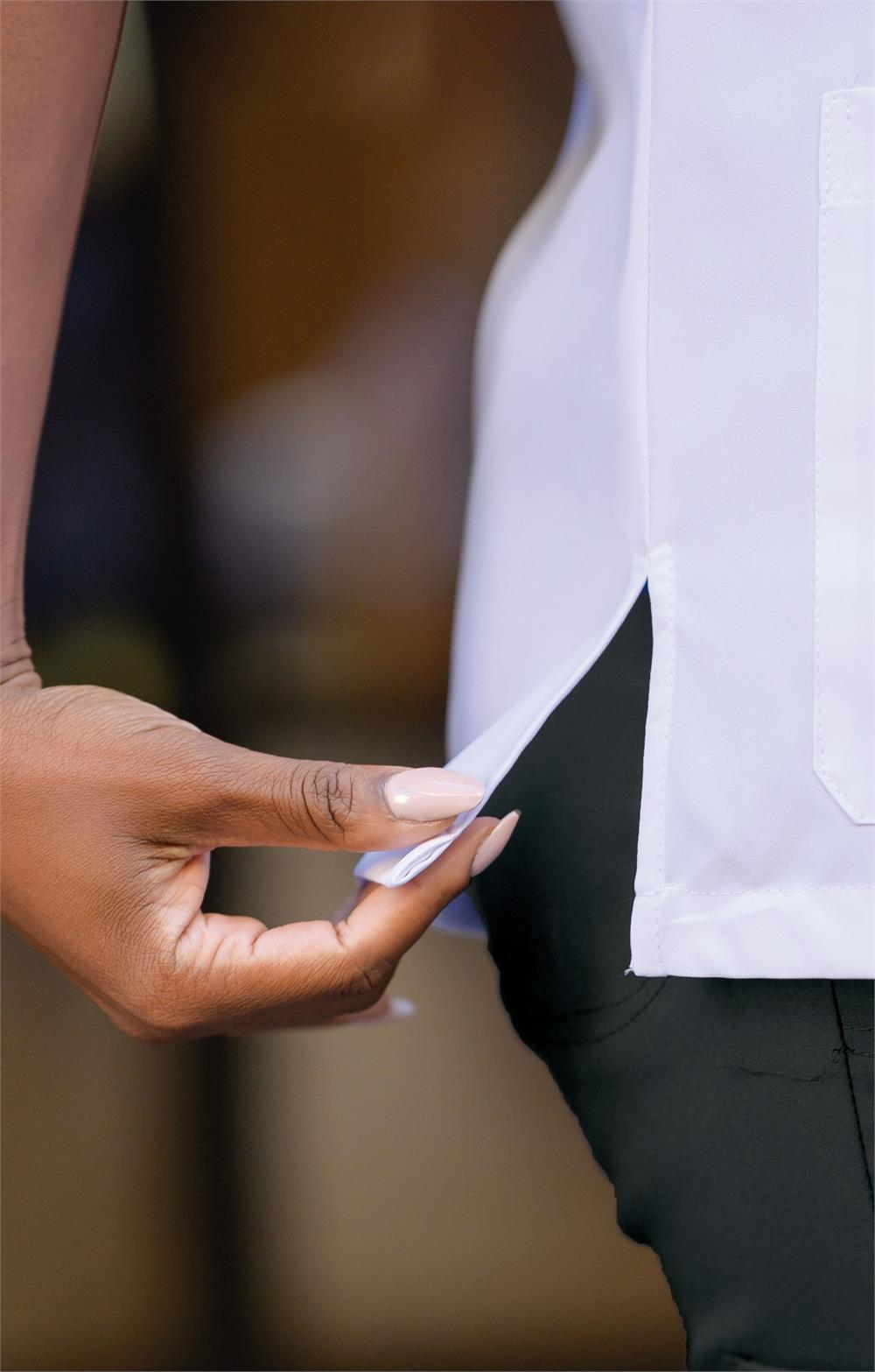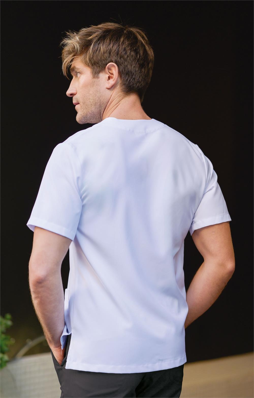 Casaca sanitaria abierta cuello pico en microfibra. Broches y doble bolsillo en pecho con ojete decorativo.