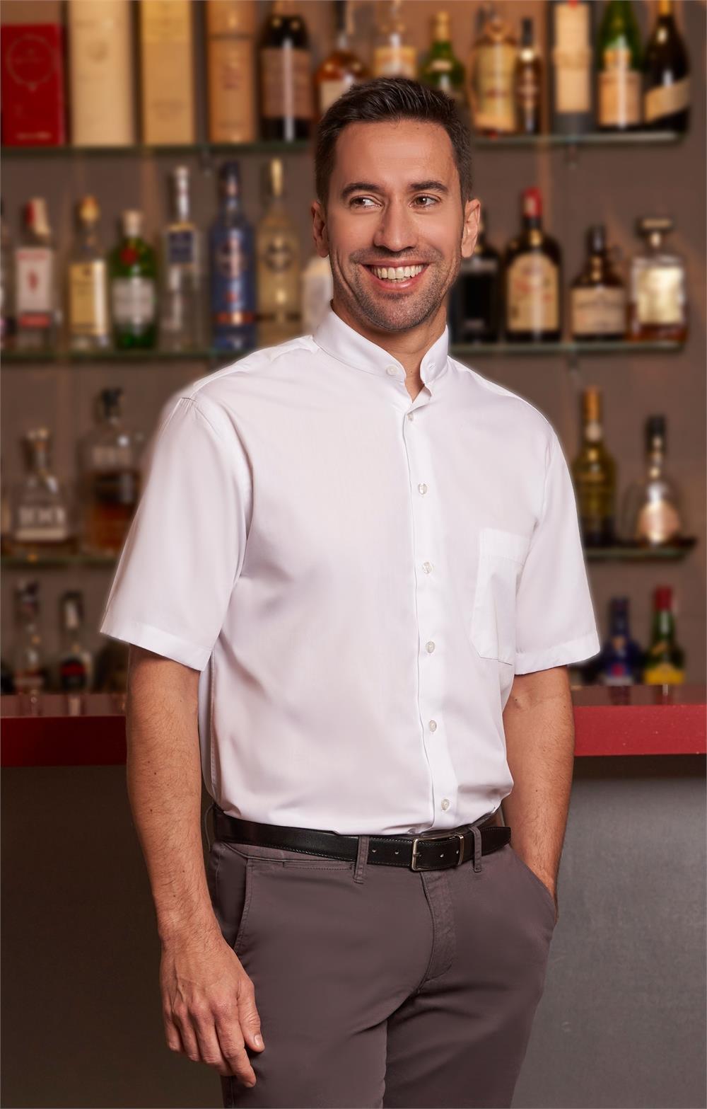 Camisa manga corta - Cuello tirilla - Un bolsillo - Pinzas en la espalda