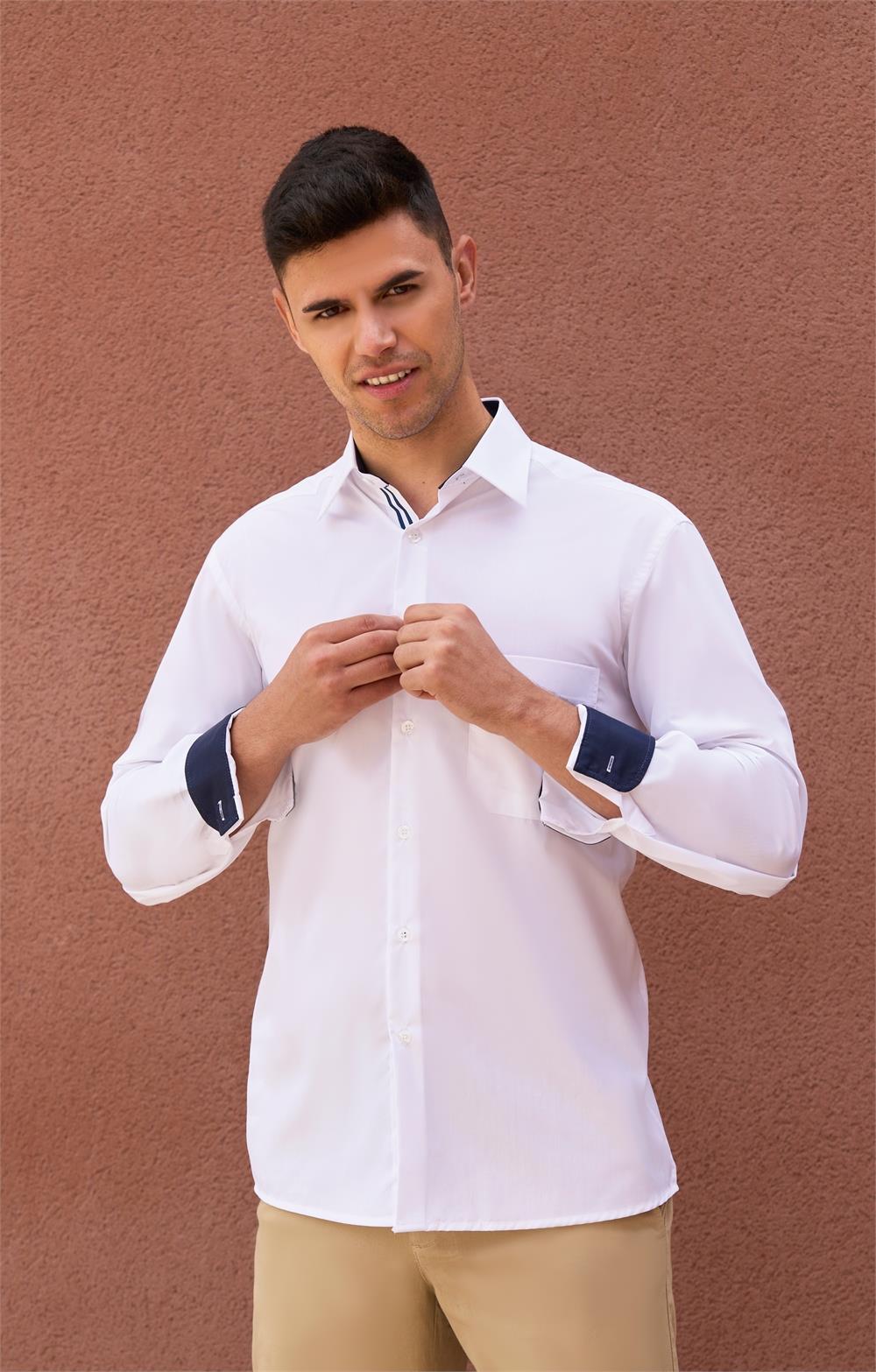 Camisa manga larga - Contraste azul marino - Cuello camisero - Botón en el puño - Un bolsillo