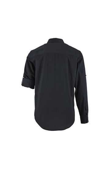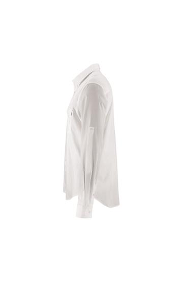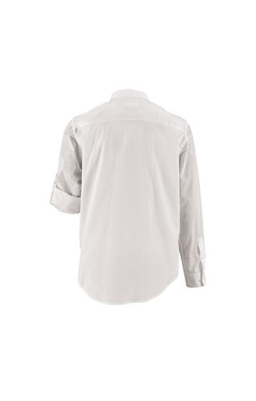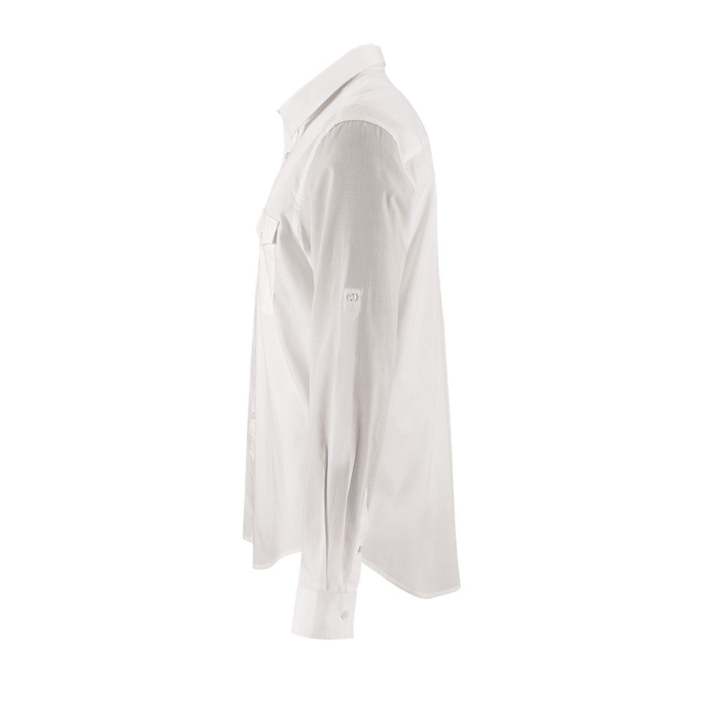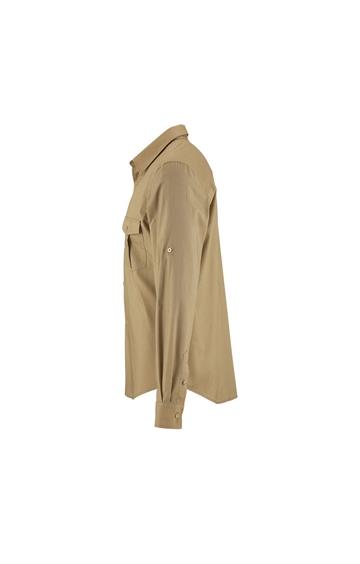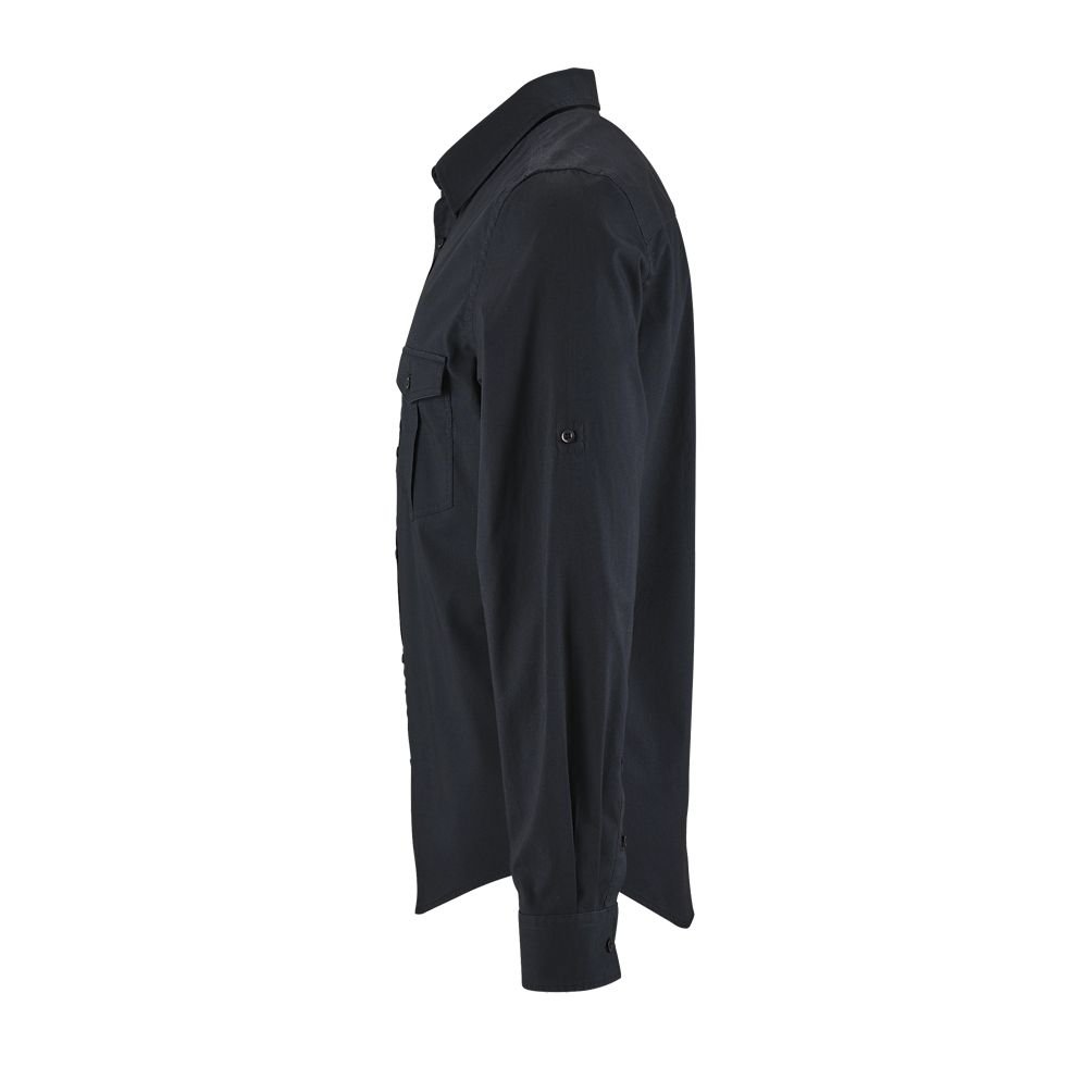 Corte recto - Mangas largas - Puños rectos con 1 botón - Abertura con tapeta en punta y botón - Tapeta de 7 botones - Tapeta para ajustar la longitud de las mangas - 2 bolsillos de pecho con solapa y botón