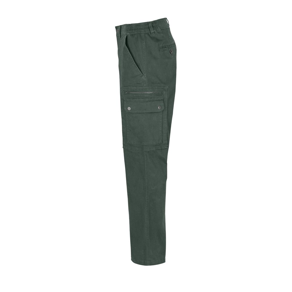 Bragueta con cremallera y botón metálico - Cintura elástica con trabillas reforzadas - 2 bolsillos laterales italianos - 1 bolsillo de parche con cierre de cremallera en la pierna izquierda - 2 bolsillos laterales de parche con solapas y botones de presión - 2 bolsillos traseros con ojal - 1 bolsillo para billetes - Corte moderno
