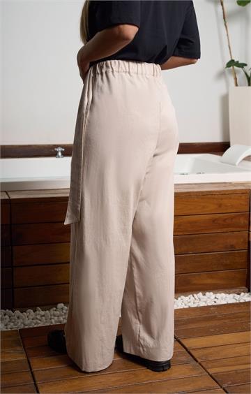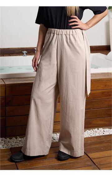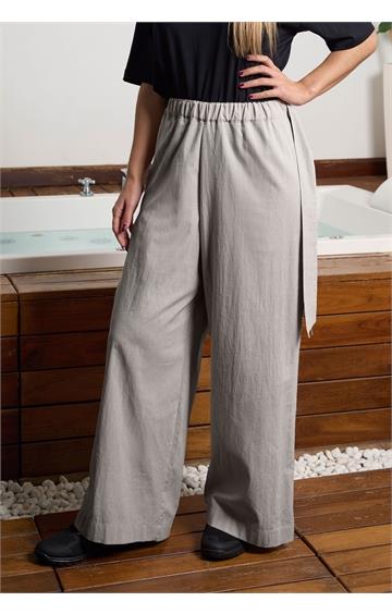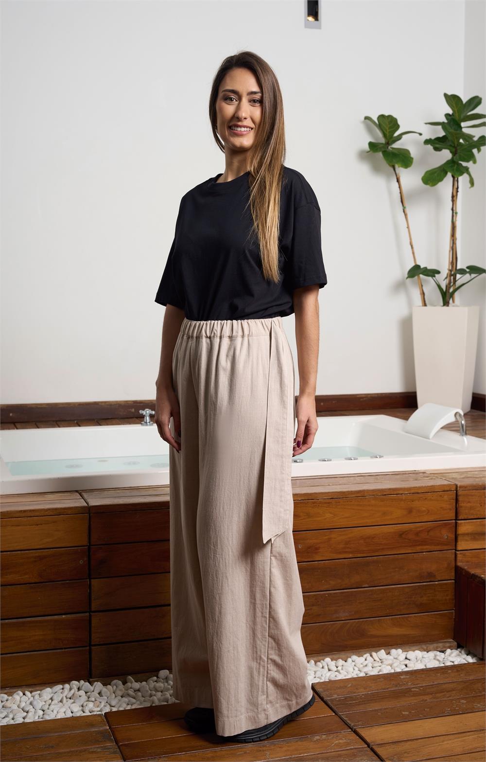 Pantalon Señora goma cintura con frunce, bolsillo francés con cintas colgando, pierna ancha