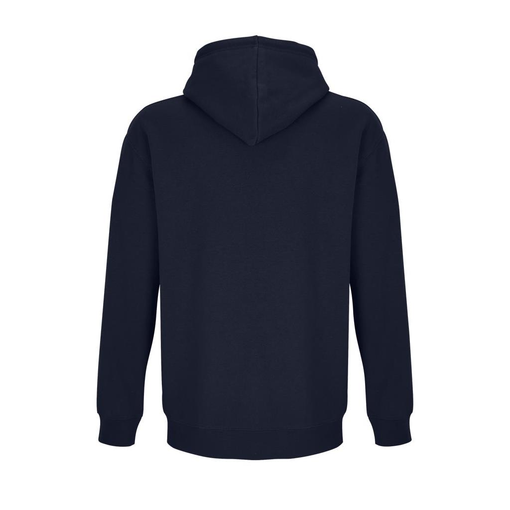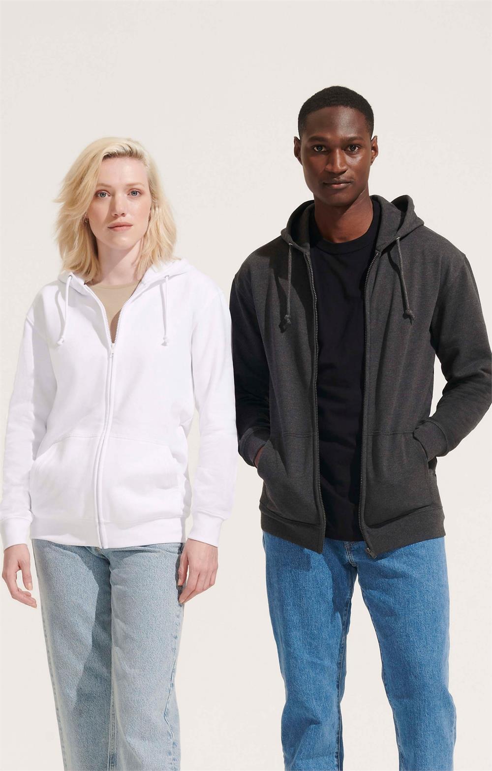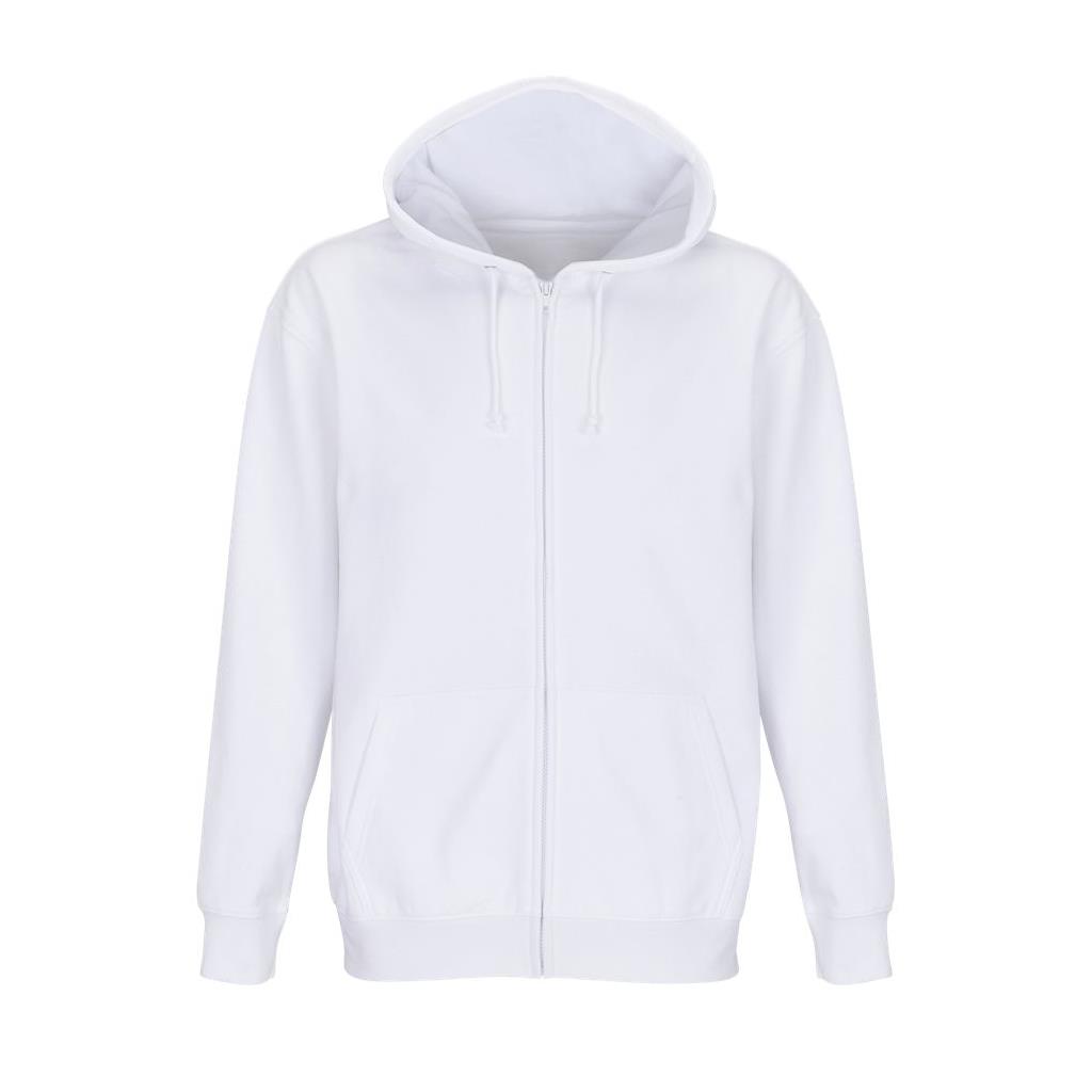 Mangas montadas - Cortada y cosida - Acabado de acanalé 1x1 en puños y bajo - Bolsillo canguro - Capucha forrada con cordón de ajuste tono sobre tono y ojales de metal - Abertura con cremallera oculta - Cremallera inyectada de plástico tono sobre tono con tirador de metal tono sobre tono - Media luna y tapacosturas de punto liso en el cuello