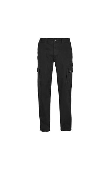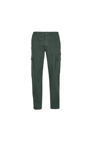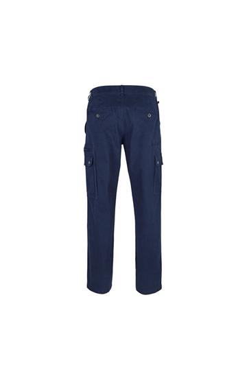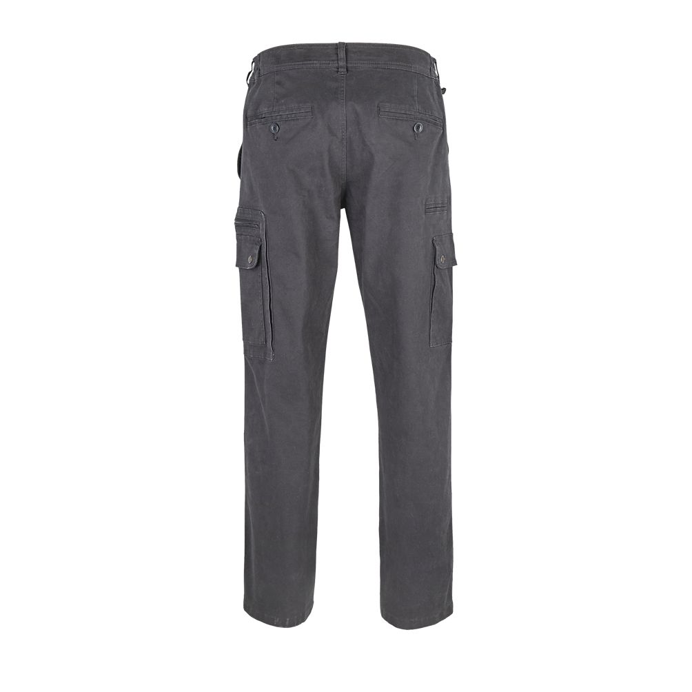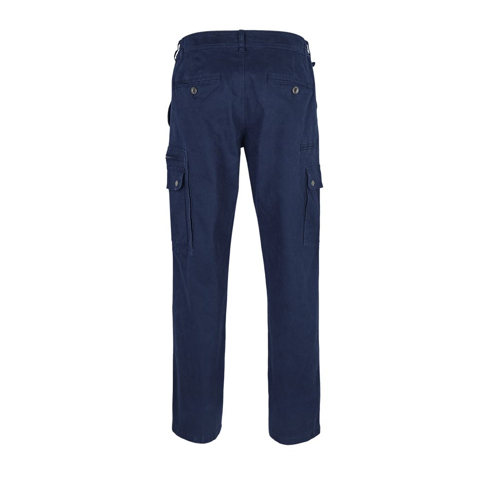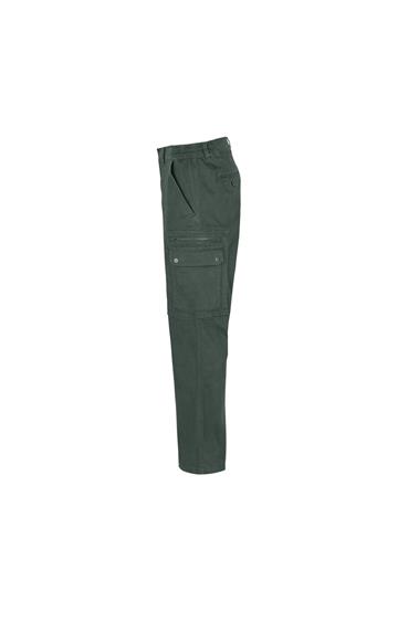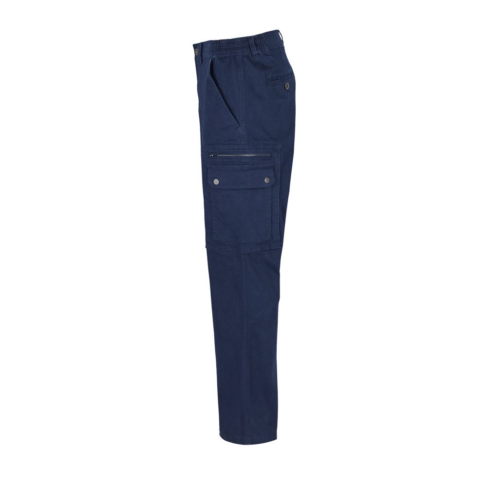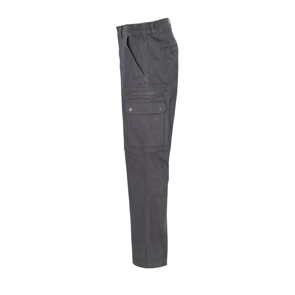 Bragueta con cremallera y botón metálico - Cintura elástica con trabillas reforzadas - 2 bolsillos laterales italianos - 1 bolsillo de parche con cierre de cremallera en la pierna izquierda - 2 bolsillos laterales de parche con solapas y botones de presión - 2 bolsillos traseros con ojal - 1 bolsillo para billetes - Corte moderno