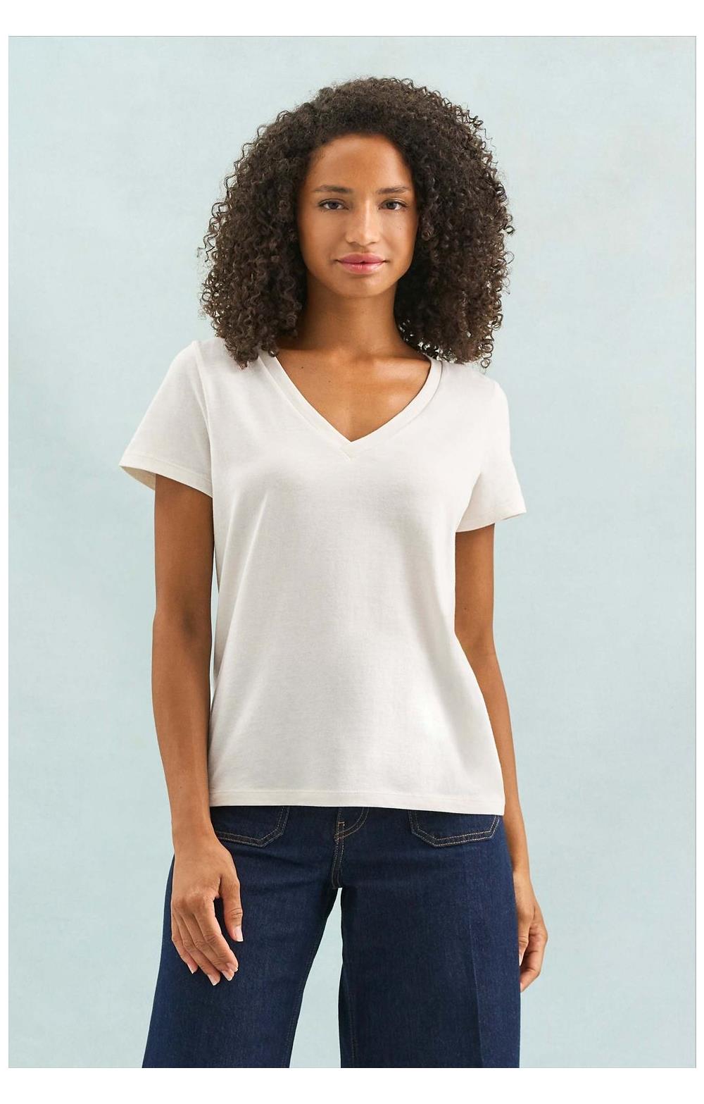Tapacosturas en el cuello - Mangas cortas - Cuello de pico de punto liso - Tubular - Corte moderno .