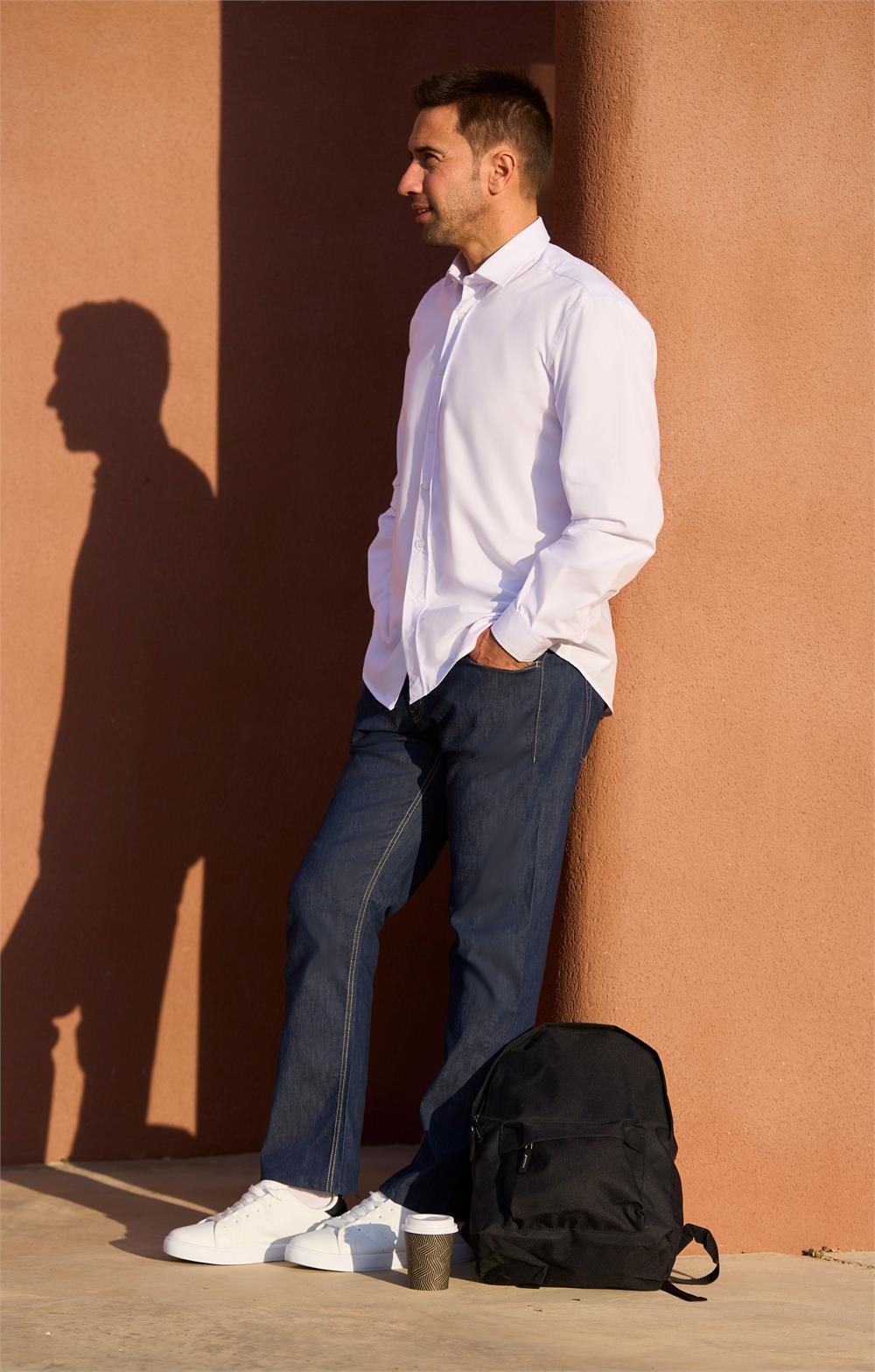 Camisa de caballero semientallada con tapeta de pellizco en el delantero, cuello sin refuerzo y puño rectangular. Tejido fil a fil color blanco